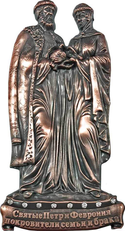 027-9CU-56-10 Магнит мет.Cтразы фигурка "Памятник Святым Петру и Февронии" цв.медь