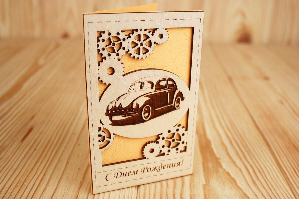 ОпдФ15-00-0016 Открытка "С Днём рождения!" с автомобилем (9*14) Фанера 3мм