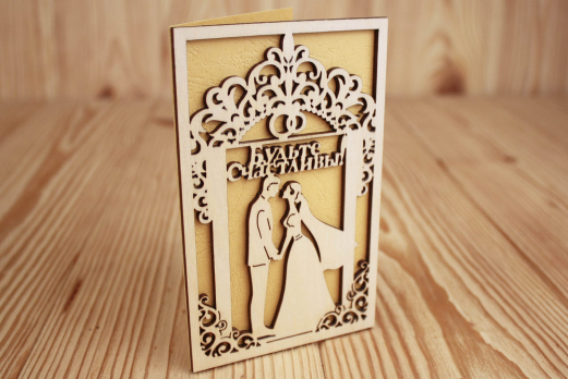 ОпдФ21-00-0016 Открытка свадебная "Будьте счастливы" с молодожёнами (9*14) Фанера 3мм